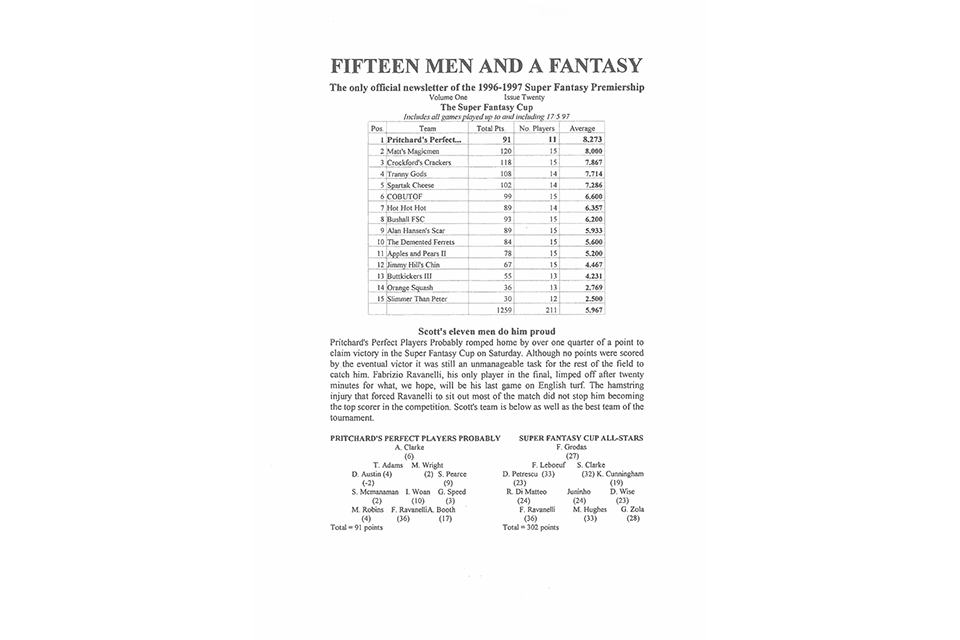 In 1996 the league grew yet again with the addition of another 3 managers. Scott Pritchard, Aaron Fenn and Craig Hunting joined the previous season's twelve managers for auction four, hosted in the the Jermy Garden in St James.