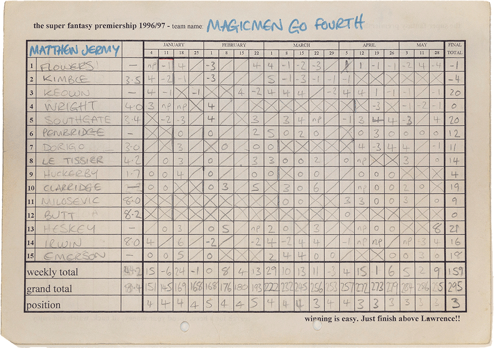 In 1996 the league grew yet again with the addition of another 3 managers. Scott Pritchard, Aaron Fenn and Craig Hunting joined the previous season's twelve managers for auction four, hosted in the the Jermy Garden in St James.